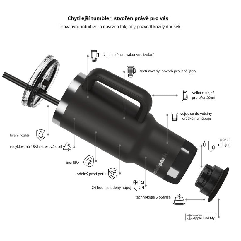 Lahev je vybavená senzorem SipSense, který zaznamenává každý doušek a pomocí přizpůsobitelného 360° LED osvětlení i volitelných zvukových upozornění ti připomene, kdy je čas se napít. Data se automaticky přenášejí přes Bluetooth do aplikace HidrateSpark, kde můžeš sledovat svůj denní příjem tekutin, nastavovat cíle a získávat přehled o své hydrataci. Díky podpoře Apple Find My navíc nikdy tumbler neztratíš.