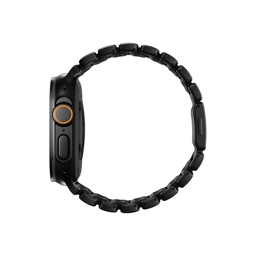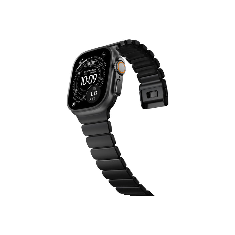 Nomad Stratos Band představuje unikátní technologický počin ve světě příslušenství pro Apple Watch, který posouvá hranice mezi elegantním náramkem a sportovním doplňkem. Tento řemínek vznikl inovativním spojením odolného titanu třídy 4 a kompresně lisované FKM pryže, čímž bylo dosaženo vzhledu klasického kovového tahu při zachování vlastností vysoce výkonného sportovního vybavení. Vnější titanové články dodávají náramku potřebnou sílu, pevnou strukturu a rafinovaný industriální vzhled. Skrze mezery v titanu jemně prosvítá vnitřní FKM jádro, což řemínku propůjčuje jeho charakteristický hybridní charakter vhodný pro každou příležitost.