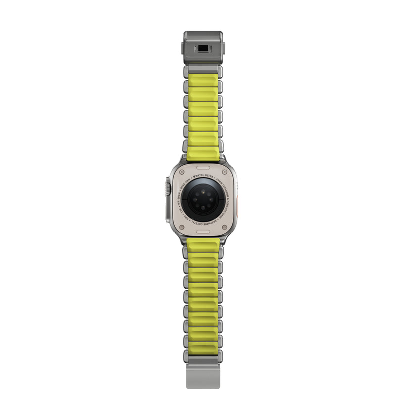 Nomad Stratos Band představuje unikátní technologický počin ve světě příslušenství pro Apple Watch, který posouvá hranice mezi elegantním náramkem a sportovním doplňkem. Tento řemínek vznikl inovativním spojením odolného titanu třídy 4 a kompresně lisované FKM pryže, čímž bylo dosaženo vzhledu klasického kovového tahu při zachování vlastností vysoce výkonného sportovního vybavení. Vnější titanové články dodávají náramku potřebnou sílu, pevnou strukturu a rafinovaný industriální vzhled. Skrze mezery v titanu jemně prosvítá vnitřní FKM jádro, což řemínku propůjčuje jeho charakteristický hybridní charakter vhodný pro každou příležitost.